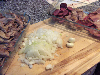 2. Assim que o pato estiver cozido (isto depende da idade do pato e do fogão, por isso, coloquem as vossas capacidades a funcionar...lol) deixar arrefecer, guardar a água de cozedura e desfiar toda a carne do pato.